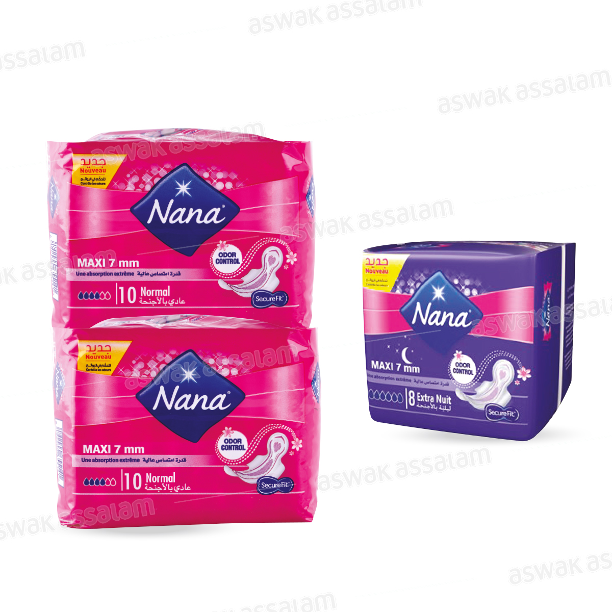 LOT DE 2 PAQUETS DE SERVIETTES HYGIENIQUES MAXI NORMAL NANA (8 SERVIETTES EXTRA NUIT MAXI)